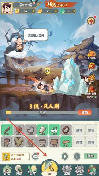 1. 开启游戏后,点击“铁镐”图标,通过敲击矿山来获取装备。