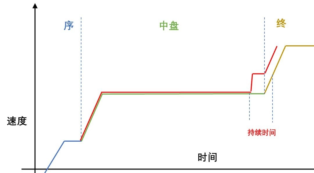 第三次是进入中盘阶段的加速,其相对重要性稍低一些——这是因为中盘阶段主要由匀速环节构成,后续会详细说明,该阶段的核心需求是中盘开启时的速度技巧。