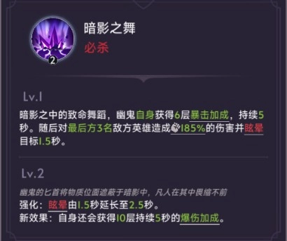 额外效果:每当有敌方英雄阵亡,幽鬼会为自身叠加一层效果,每层提供8%的暴击率与爆伤率加成,该效果最多可叠加至5层。