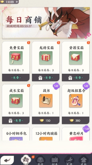集市里每天都能领取四种福利宝箱,另外还会随机刷新出各类龙将碎片和稀有道具,这些都能用元宝购买,大家可以根据自己主力阵容的需求来选购。