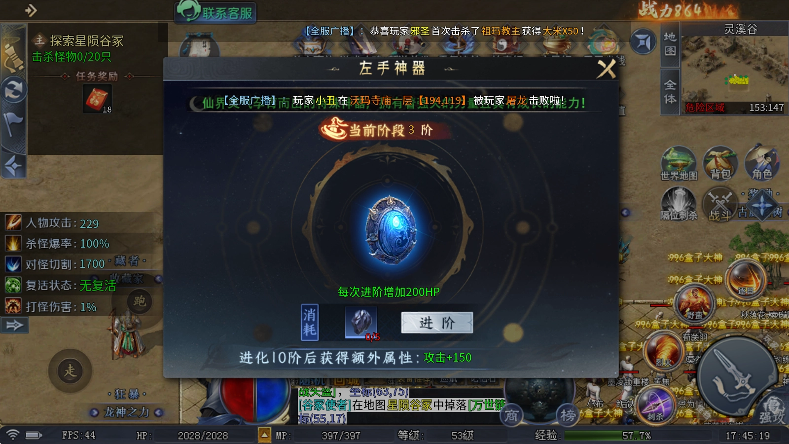 左手所持的这件神器,只要消耗千年玄铁就能实现进阶,每完成一次进阶都能增添200点HP属性,并且当它进化到10阶之后,还能解锁额外的属性加成。
