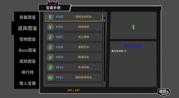 玩家若想查看游戏内的各类信息,比如装备、道具、怪物和boss等,都能在主界面的宝藏手册里找到。不仅如此,手册中还能查询排行榜,以及自己的成就和奖章。随着游戏剧情的逐步推进,手册里的内容也会慢慢呈现出来。