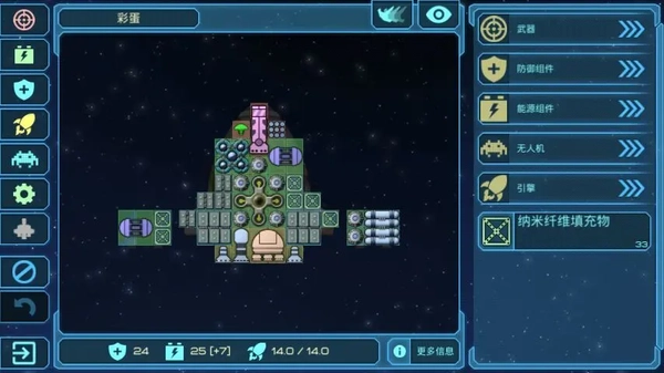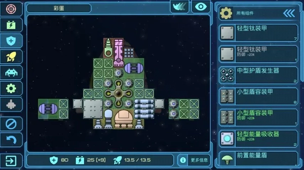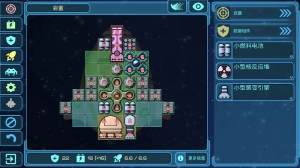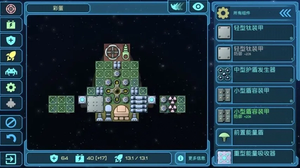 护卫舰“彩蛋”在游戏前期表现十分强势,不仅自身携带不少优质装备,武器格还是通用点位,几乎能兼容所有类型的武器,飞船格子的可塑性也很强,更自带一定的动能抗性,前期探索和战斗基本都得靠它来撑场面。