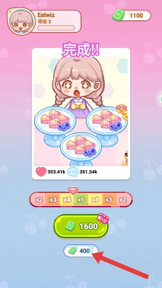直播结束后,会弹出【完成!!】的界面,点击领取【400】等奖励,这些奖励可以用来解锁新甜品或者升级直播设施。