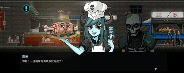 《餐瘾地城》(英文名Dungeon Munchies)是一款无厘头风格的横版动作闯关游戏。游戏的背景设定在一个荒诞离奇的地下城世界中,玩家将扮演由死灵厨师西米创造的僵尸角色,在西米的帮助下开启地下城冒险之旅。在冒险过程中,你需要通过击败敌人来收集各类菜谱与食材,通过食用特定的食物来提升自身的各项属性。