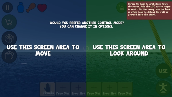 玩家进入游戏后,会置身于一块2×2的小木筏之上,此时身边除了手中握着的钩子外,再没有其他任何物品。
