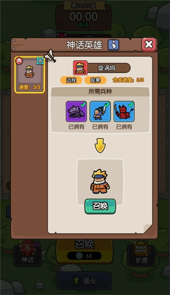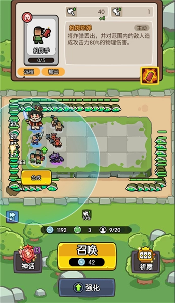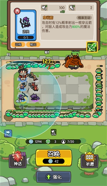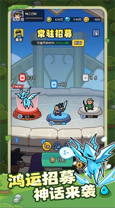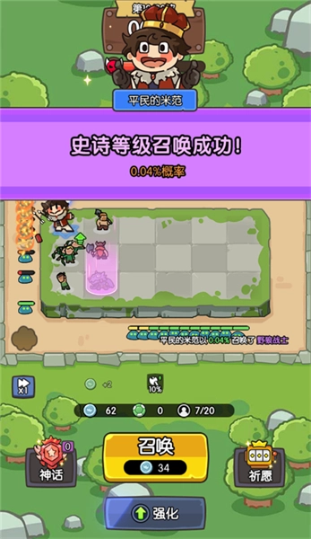 《神之召唤》是一款卡通风格的休闲策略塔防游戏,采用竖版界面设计。玩家需在游戏中布置各类强力英雄,以阻挡敌人的攻势。游戏内提供了两种核心成长路径:一是通过强化系统提升现有英雄的属性;二是将三个相同的英雄进行合成,从而解锁更强大的英雄角色。