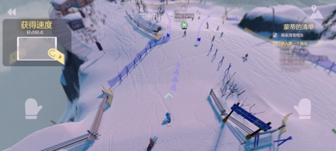 接下来就可以开始滑雪了,首先请按动你两侧的按钮让滑板获得速度,然后加速前进。