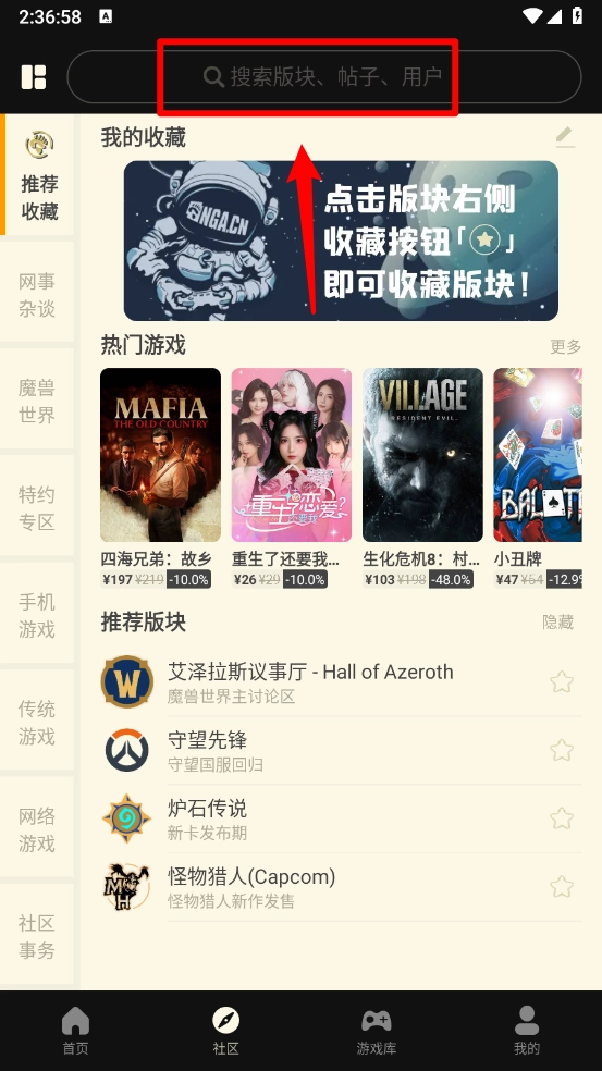 如图所示,在社区板块点击上方的搜索框。