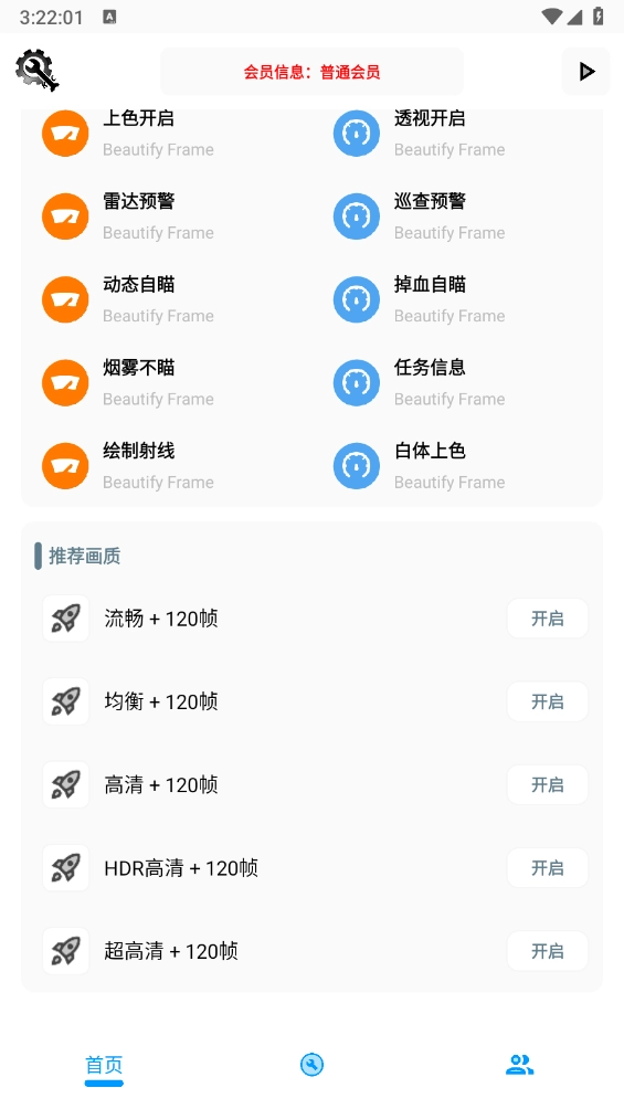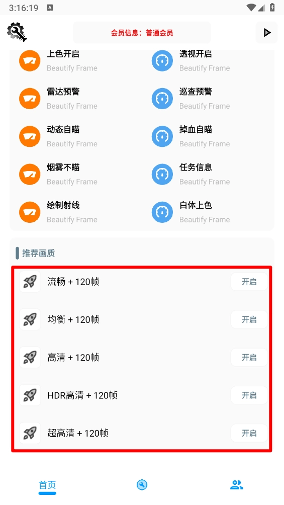用户在首页滑动至最底部后,可选择对应的画质选项来开启使用。