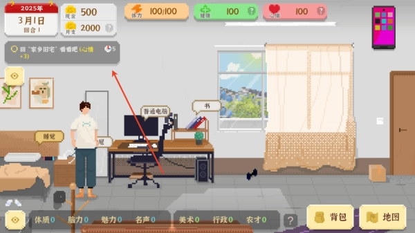 这是一款人生模拟类小游戏,玩家将扮演失业后回到县城的青年,从零起步规划并经营自己的人生。