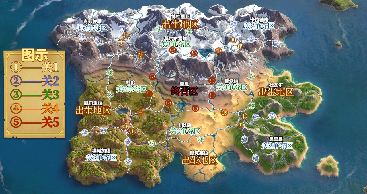 S2赛季的关卡位置分布和S1相比有显著不同:S1赛季里,通关关1后会解锁一个全新的地区作为争夺区域;到了S2赛季,通关关1后开启的是全新可争夺的地区界【符文先祖雕像】(雕像的详细说明将在后面介绍),领主们只要参与争夺并持续占领这个地区界,就有机会获取丰厚奖励。