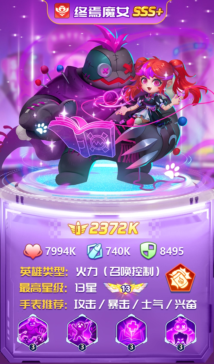 对终焉魔女的技能进行解读后会发现,她的技能机制是为所有召唤物提供回血效果与属性增益。基于这一特性,将其与灵能特工组合,两者可共同召唤出大量召唤物,再借助终焉魔女的恢复与增益能力,能够显著提升召唤流派的整体战斗表现。此外,终焉魔女的大招具备强大的控制效果,若搭配火凤女王施加的强力持续伤害状态,能让火凤女王持续稳定地输出巨额伤害。