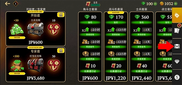 在首页能看到可氪金购买的普通宝箱和更高级的红宝石宝箱,若想购买其他宝箱,可点击右侧的宝箱图标。