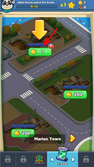 在城镇界面中,点击箭头所指向的金币选项,消耗相应数量的金币来解锁区域,这一操作是推进城镇建设的方式。
