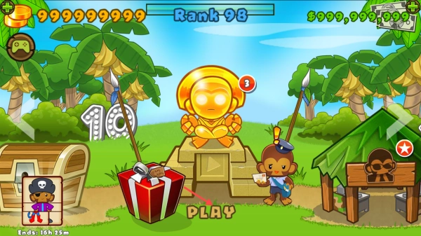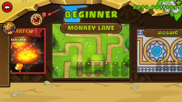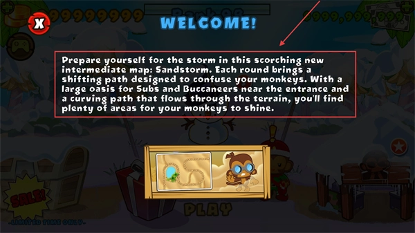 在这张备受关注的中阶地图“沙尘暴”里,来迎接风暴的挑战吧。每一轮变化多端的移动路线会考验你猴子军团的随机应变能力。入口周边有一片能让潜水猴和海盗船大显身手的广阔绿洲,蜿蜒的路径在地形中曲折延伸,不少优势位置正等着你的猴子们展现出色表现。