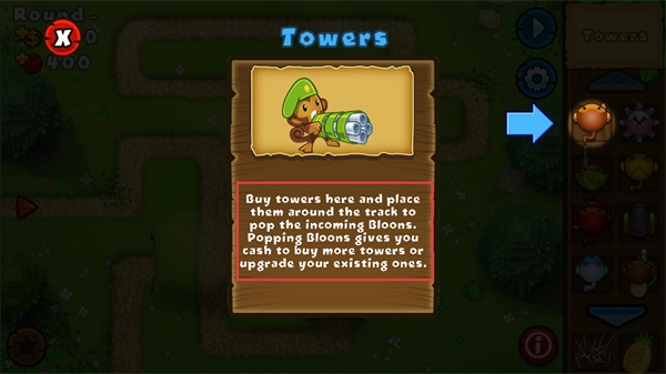 在【Towers】界面选购塔楼,把它们布置在路径周边来攻击【Bloons】,通过这种方式获得现金,以便添置更多塔楼或是对已有的塔楼进行升级。