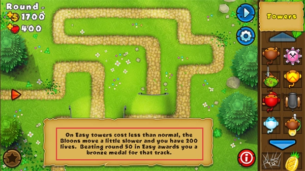 选择【Easy】模式时,塔楼的成本会更低,而且【Bloons】的移动速度也比较慢,玩家拥有200点生命值,目标是通过50关来获取对应的铜牌。