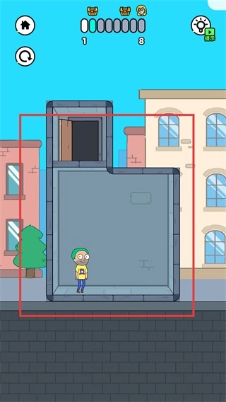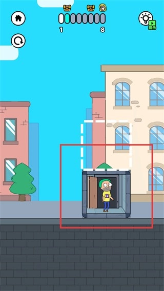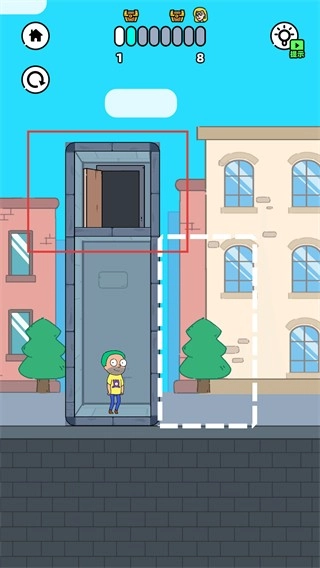 拖动电梯区域的白色虚线部分来调整电梯的空间布局,使得角色和顶部电梯门之间的路径能够连通,从而推进通关进度。