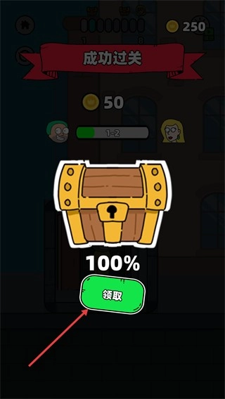 成功通过关卡后,你将获得50金币和100%进度宝箱,点击【领取】按钮即可获取这些奖励。