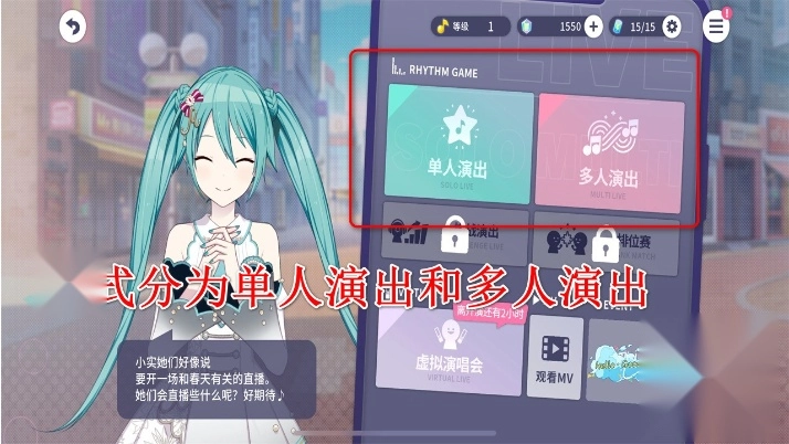 演出模式包含单人演出和多人演出两种类型。单人演出时,玩家需独自完成歌曲表演以冲击更高分数;多人演出则是五位玩家共同参与,协作完成同一首歌曲的演奏。