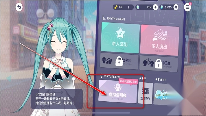 进入初音未来缤纷舞台游戏之后点击右下角的演出。