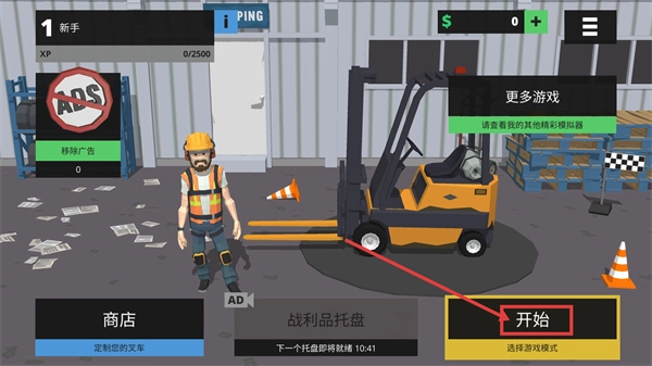 1、点击【开始】按钮挑选游戏模式,以【新手-XP-0/2500】的身份启动叉车模拟任务,操控叉车进入游戏场景。
