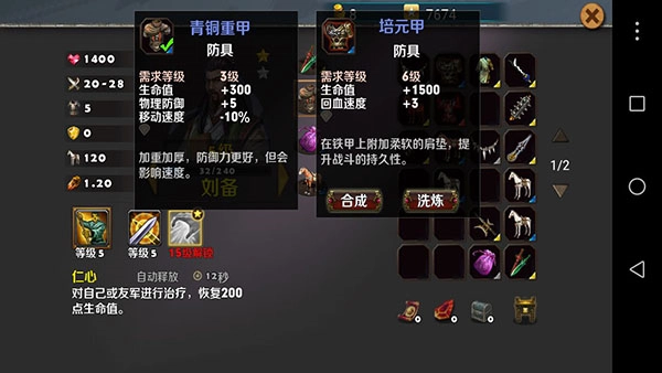 在你用战功兑换了大量宝箱后,不少装备都闲置了,这时就能用上合成功能——三个同色装备可合成一件高一级的装备,成功率为33%。建议优先合成防具,装备相关的内容就介绍到这里。