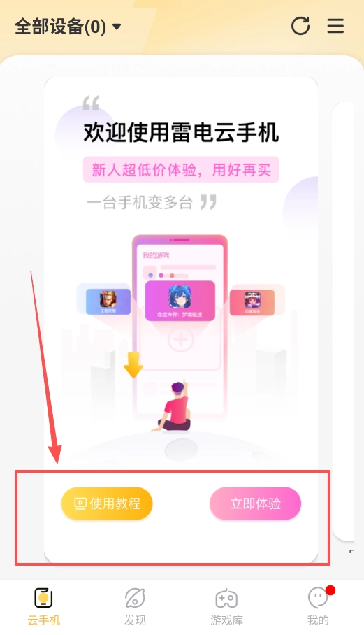 进入主界面后,系统会引导你体验云手机,记得查看“使用教程”以了解各项功能,“我的游戏”板块可帮助你统一管理已安装的游戏。