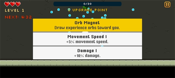 2、获取升级点数后,可从OrbMagnet(吸引以太碎片)、MovementSpeedI(移动速度+5%)与DamageI(伤害+10%)里挑选其一。前期推荐优先选OrbMagnet,这样能提高资源收集的效率。