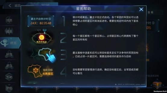 3、在霸主计划开启前,大家可以在军团界面自由选择要进攻的星系。另外,所有星系会被划分成若干星区,关于这部分的具体内容,军团内的统治界面有详细说明,到时候大家可以自行打开查看哦~