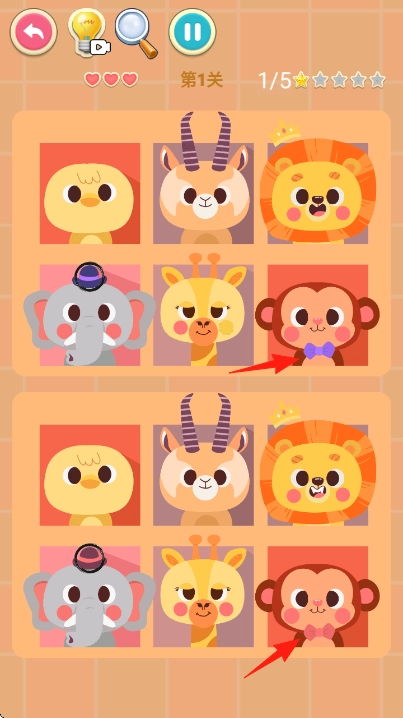 1、仔细观察上下两排动物,找出它们之间存在差异的位置,比如戴帽子的大象,其帽子样式有所不同,按照箭头的指示,点击将差异位置圈出来。