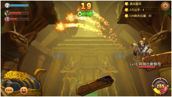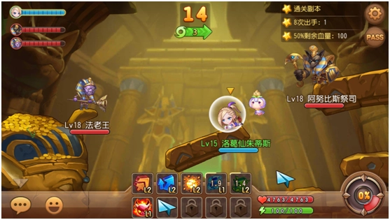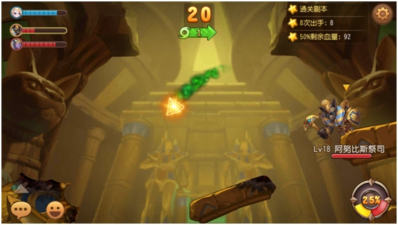 分析这张地图,通关难度不大。左边精英怪的血量比右边BOSS少,所以优先攻击精英怪能降低所受伤害。只要合理分配有效攻击,8次出手结束战斗并非难事。不过要注意,两个怪物的攻击力都很高,在2V1的局面下,8个回合内让它们血量过半其实不太容易做到。