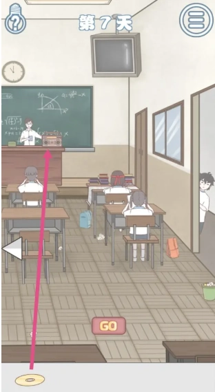 7、第7关: 拉开自己的板凳→把游戏机给男生→交换书本→将书递给女生→获取钢笔→把钢笔交给右上方的女生→得到光盘→放入录音机。