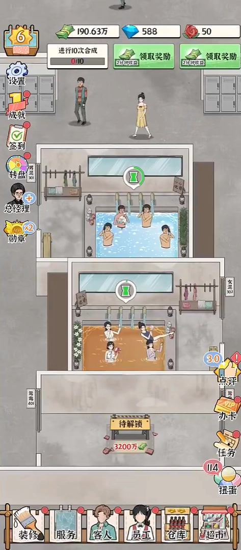 《浴场之王》是一款兼具趣味性与挑战性的模拟经营游戏,玩家将化身洗浴中心的经营者,从一家简朴的小店开启创业之路,逐步扩张为规模宏大的豪华洗浴帝国。该游戏的手机版本配备了完善的建设与管理系统,玩家能够依据多样化的需求自主规划场地布局,对各类设施设备进行升级改造,致力于打造出舒适惬意、令人心旷神怡的服务环境。 在游戏过程中,玩家还需要开展员工招募工作,并对他们进行专业技能培训,以此提升洗浴中心的整体服务品质,从而吸引更多顾客前来消费体验。同时,面对瞬息万变的市场需求,玩家必须灵活调整经营策略,持续优化管理方式,让自己的洗浴中心在竞争白热化的行业中崭露头角,成为行业内的佼佼者。