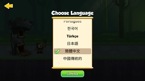 1、在本站下载并安装游戏后打开游戏,首次进入时可设置游戏语言,只需下拉找到简体中文并点击Continue即可。游戏自带中文,可放心体验。