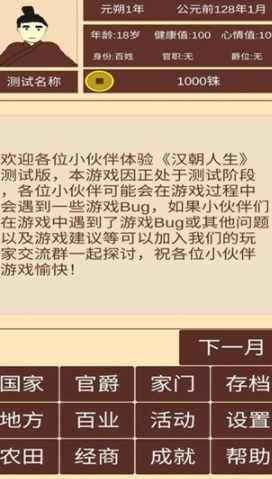 汉朝人生是一款极具趣味的文字历史模拟游戏,玩家将在游戏中穿越回西汉时期。在这里,你既可以选择种田或经商来积累财富,也能够自立门户争夺天下,人生的发展方向完全由你决定!此外,游戏中还还原了诸多真实的生活场景,并且为玩家提供了多种不同的职业选择,你可以体验到精彩欢乐的玩法,还有丰富多样的人生故事等待你去发掘,让你的汉朝生活更加充实丰富。