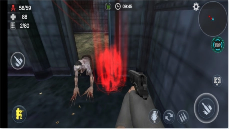 2、射击玩法说明 界面右下角设有三个功能按钮:最上方的是装弹按钮,中间的是射击按钮,最下方的是近距离瞄准调试按钮(开启后能提升射击精准度)。当瞄准器变为红色时,即表示已对准僵尸,需立即射击。此外,左上角的地图也需留意,一旦出现红色光点,就意味着有僵尸出现。