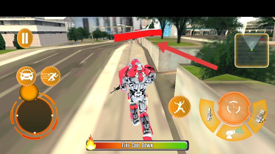 进入作品后,首先挑选自己喜欢的机器人样式和消防车样式,接着熟悉横版控制界面——左侧按键用于控制移动方向,右侧按键则负责发起攻击。