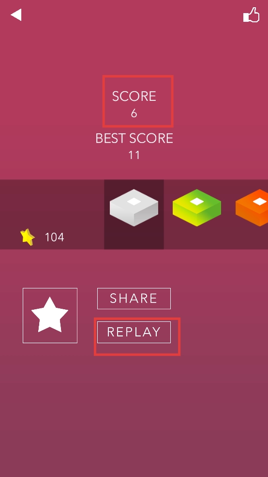 3、关卡结束后,界面会展示本局的成绩情况。若想重新挑战以提升分数,点击REPLAY按钮即可;此外,还能进行成绩分享、查看最佳分数等操作。