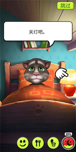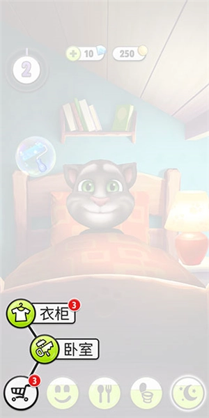 6、玩得有点累啦,汤姆猫得去休息一下,现在点击下面的月亮图标就能进入卧室啦。