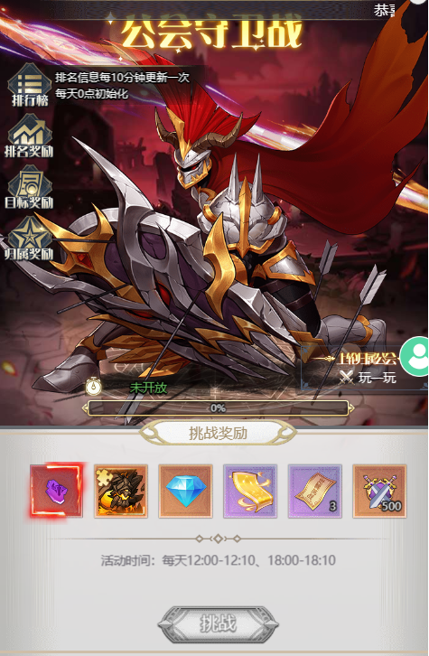 活动的举办时段是每日的12点到12点10分、18点到18点10分。奖励设置包含挑战奖励、排名奖励、目标奖励与归属奖励这四类,对应的奖励图示见下方(温馨提示:参与活动需先加入公会)。
