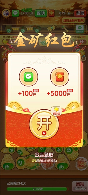 这款名为“富贵如意”的2048合成游戏福利满满。玩法很简单,玩家只需快速合成相同等级的如意,就能获取福利、解锁更高级别的如意;当合成到特定等级的如意后,右下角的智能掉落功能就会开启,无需过多操作就能轻松加速合成;此外,累计消除一定次数还能领取额外奖励哦。