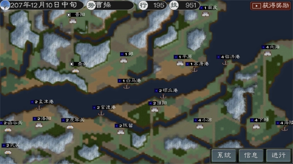 屏幕上方的“行”字代表行动力,它是你开展军事和内政行动的基础。游戏前期行动力十分有限,显得尤为珍贵,务必避免浪费!一旦行动力耗尽,就只能暂时搁置操作,等待下一回合刷新了。