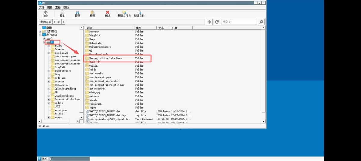5、成功启动后,找到D盘下的“Servant of the Lake Demo”文件夹