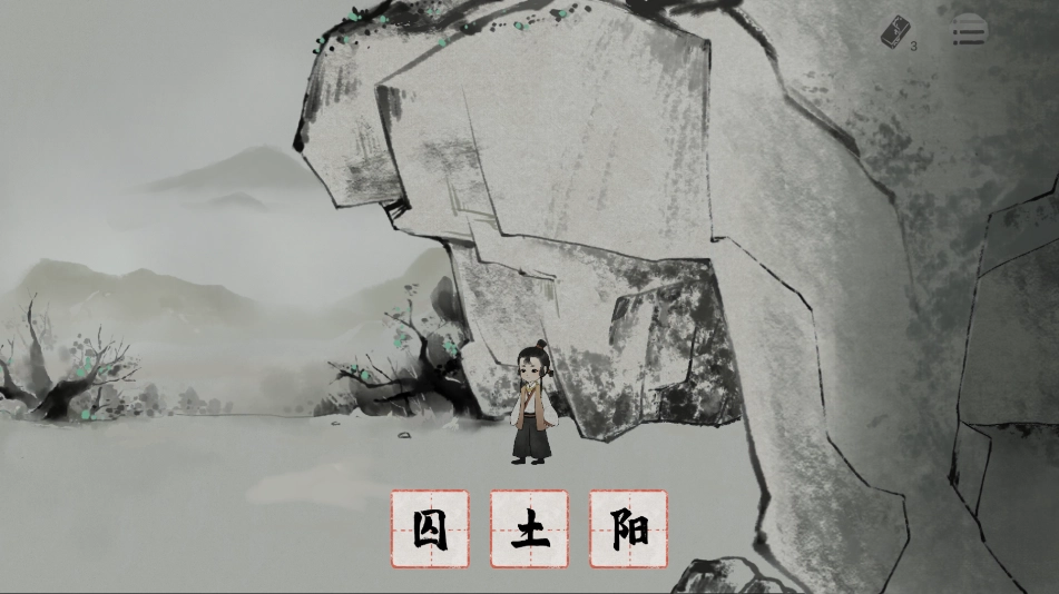 6、进入后能看到一名囚犯,收集他后会获得一个“囚”字,随后出来向左走,到土堆前收集“土”,再抬头仰望收集“太阳”