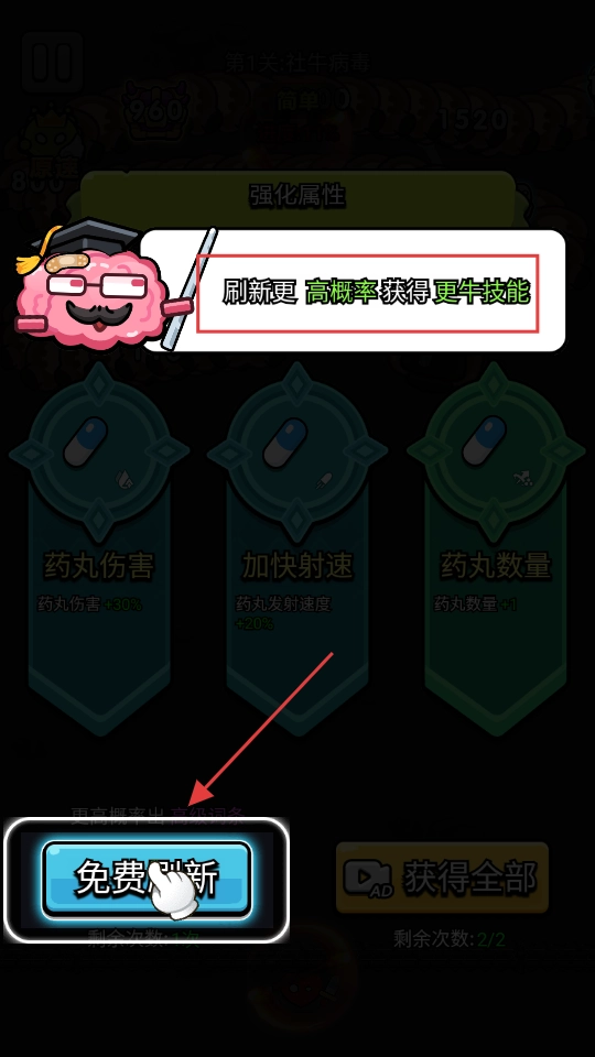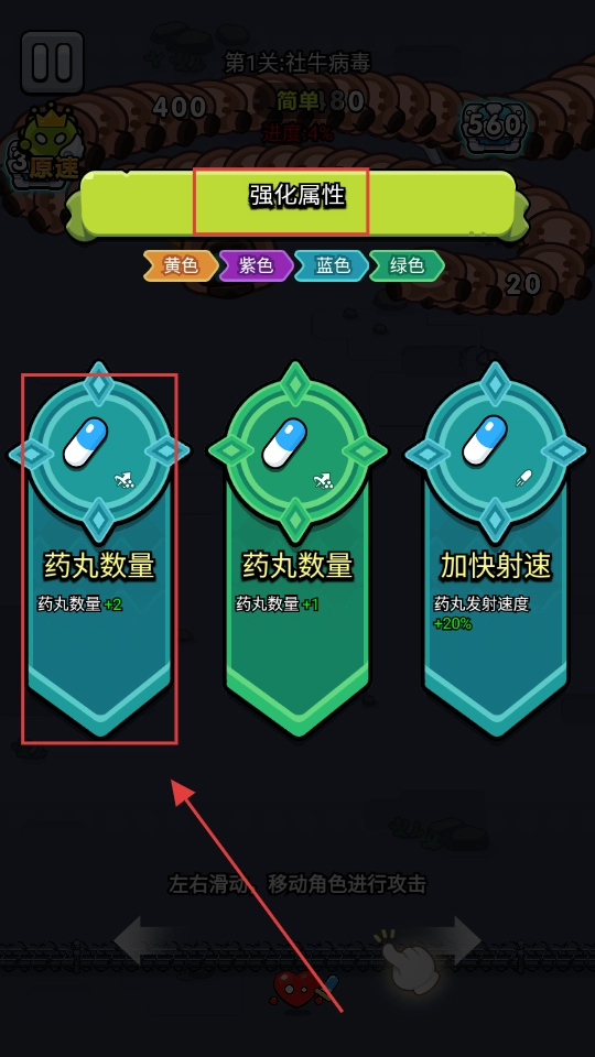 1、强化时选择【药丸数量±2】的属性,通过增加药丸数量来提升输出频率,以便在前期快速清除病毒积累优势。
