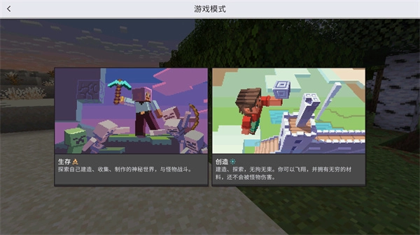 3、除了基础的生存模式外,还有创造模式与侧重地图玩法的冒险模式,这几种模式的特点各有不同:创造模式便于进行各类建筑创作,冒险模式则更适合探索和体验地图内容。