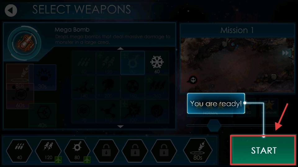 2、在武器选择界面选定武器后,点击【START】按钮,即可开启【Mission1】的防御任务。