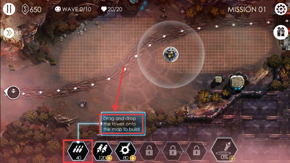 3、消耗【40】资源,将下方的塔拖拽至地图上进行建造,搭建防线以抵御外星入侵。